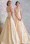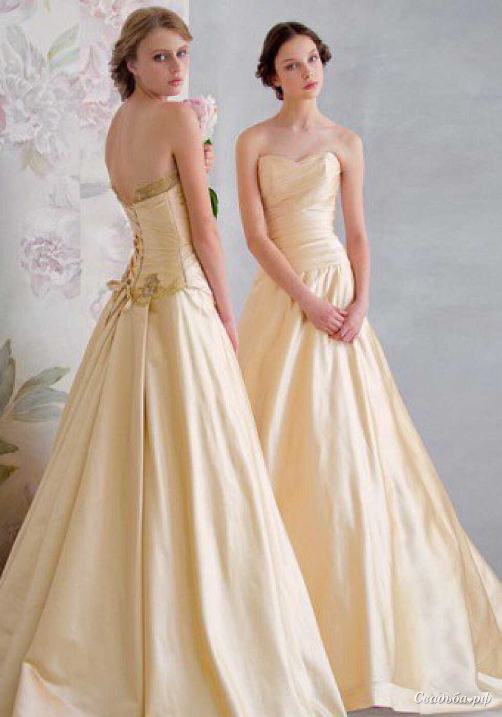 Классическое свадебное платье А-силуэта, выполненное в минималистическом стиле темно-кремового цвета (как на картинке); лиф платья c вырезом сердечком, украшенный драпировкой. В комплекте с платьем идет кружевное расшитое болеро с длинным рукавом.