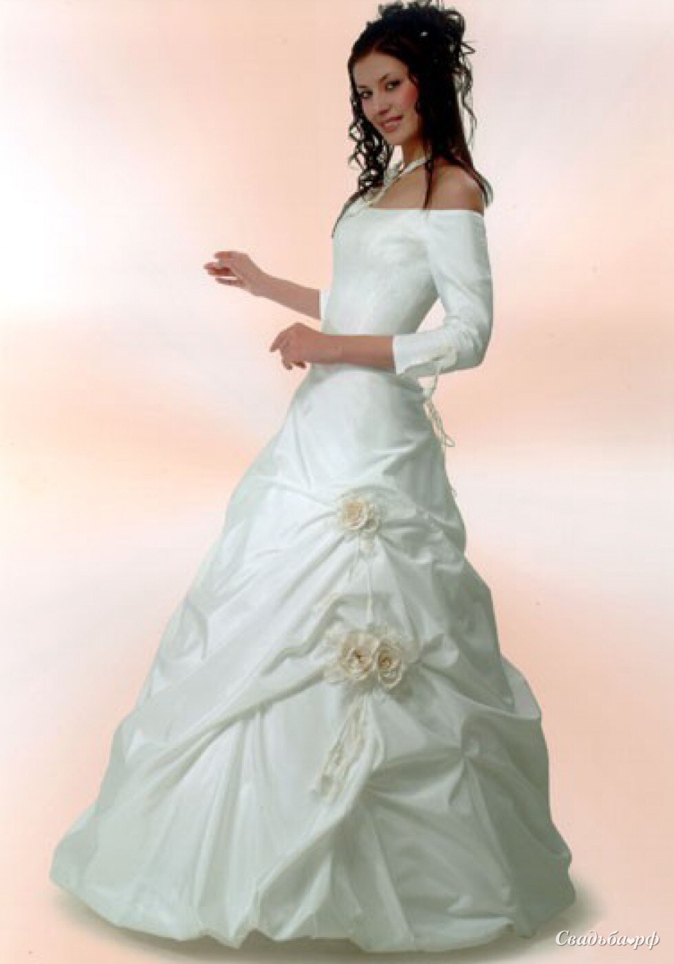 Нежный наряд, состоящий из корсета и юбки, с рукавами средней длины. Топ с вырезом лодочка подчеркнет изящные плечи невесты. Юбка А-силуэта, украшенная зажимами из нежных роз, напомнит о царской свадьбе конца 19 века. А грамотно подобранные по стилю аксессуары отлично дополнят этот и без того шикарный свадебный туалет.