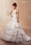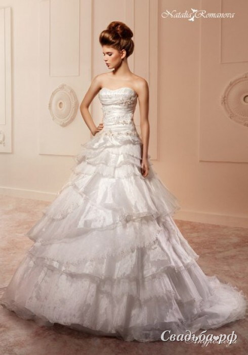 Свадебное платье, привлекающее своей необычностью. Корсет полностью декорирован драпировкой и аппликацией из ткани, а многоуровневая асимметричная юбка, состоящая из воланов из тканей разной фактуры и длины, делает ее особенно оригинальной, по низу воланы украшены кружевной оторочкой. Внимание на весь день вам обеспечено!