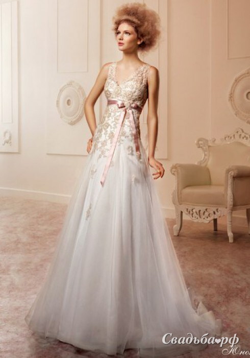 Прямое платье, совмещающее два цвета. Очень яркий кремовый топ расшит цветами и украшен лентой под грудью. От бедер идет летящая белая юбка. Открытый лиф на кружевных бретелях, с соблазнительным V-образным вырезом. В этом наряде есть все, чтобы вы чувствовали себя неповторимой. Лучший выбор для худенькой, стройной девушки.