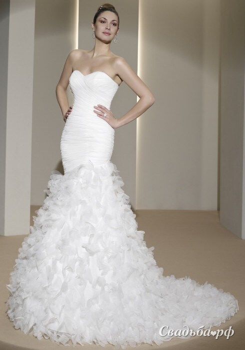 Платье с открытыми плечами и изумительно стройным силуэтом. Контраст между тугим заниженным корсетом и пышной юбкой от бедра делает фигуру зрительно тоньше и длиннее. Корсет с не глубоким вырезом сердечком украшен драпировкой. Воздушную юбку со шлейфом украшает множество пышных воланов. Стильно и со вкусом.