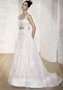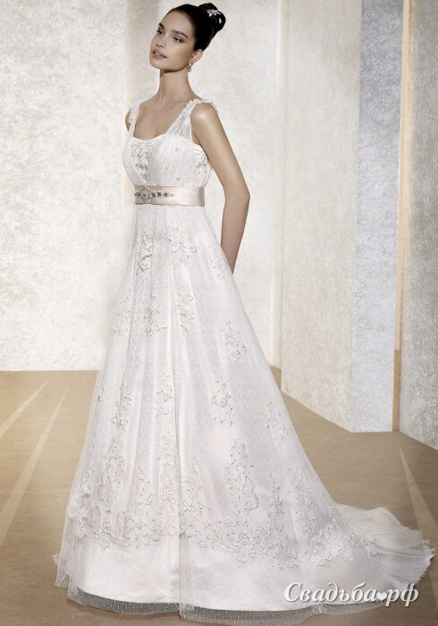 Романтичное платье с яркой деталью и изящными полупрозрачными бретелями. Все платье покрыто тонкой тканью украшенной кружевной аппликацией, корсет полностью расшит и подпоясан атласной лентой с вышивкой стеклярусом и паетками. Изящная юбка переходит в шлейф. В таком наряде вы будете чувствовать себя в центре внимания.
