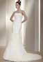 Роскошное платье без бретелек фасона годе. Оно создаст красивый силуэт, при этом не нагружая образ деталями. Ровный лиф и низко посаженный корсет декорирован искусно выполненной драпировкой. Примерно от колена юбка, украшенная множеством воланов, пышно расклешается. Наряд для обладательниц утонченного вкуса.
