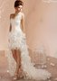 Дерзкое и откровенное короткое свадебное платье порадует смелых невест. Корсет плотно облегает талию. Открытый лиф без бретелей демонстрирует зону декольте. Одно плечо украшено множеством декоративных перьев. Объемная пышная юбка идеально сочетается с верхней частью наряда. Спереди юбка короткая, а сзади длинная, плавно переходящая в шлейф.