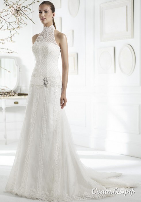 Винтажное свадебное платье с заниженной талией и изящной стоечкой под самое горло придётся по вкусу самым стильным невестам. Представленный наряд со струящейся юбкой и длинным шлейфом полностью декорирован нежным кружевом. Платье подчёркивает достоинства фигуры. Мы также предлагаем подбор фаты, перчаток, диадем, бижутерии к данной модели.