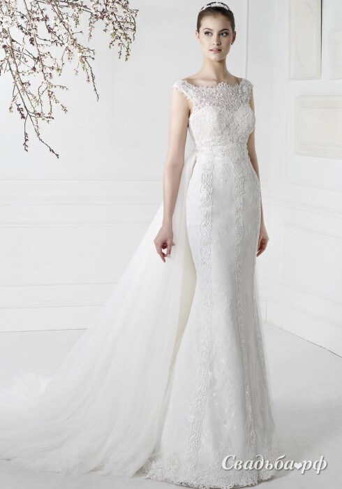 Королевское кружевное свадебное платье с открытой спиной и скромной зоной декольте. Облегающая юбка выгодно подчёркивает все изгибы фигуры. Сзади модель дополнена шикарным шлейфом из полупрозрачной ткани. Наряд дополнен вышивкой и кружевными вставками. Мы также предлагаем подбор фаты, перчаток, диадем, бижутерии к данной модели.