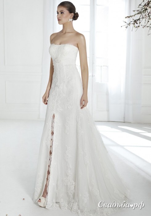 Изящное свадебное платье с открытой зоной декольте и соблазнительным вырезом юбки. Представленный наряд декорирован кружевными вставками и тончайшей вышивкой ручной работы. Длинная юбка переходит в шлейф. Мы также предлагаем подбор фаты, перчаток, диадем, бижутерии к данной модели.