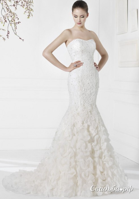 Очаровательное свадебное платье с открытой зоной декольте выгодно подчеркнёт женственные изгибы вашей фигуры. Облегающая модель дополнена оригинальной юбкой с длинным шлейфом и многоярусными воланами. Мы также предлагаем подбор фаты, перчаток, диадем, бижутерии к данной модели. Действует скидка -5%. Подгонка по фигуре - БЕСПЛАТНО!