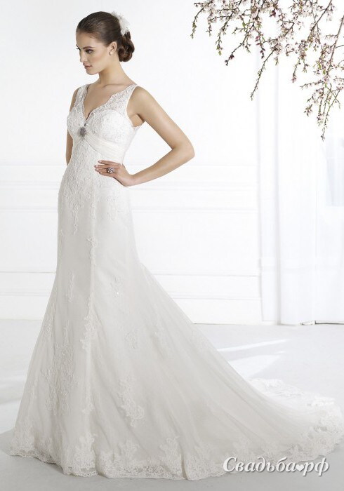 Сногсшибательное кружевное свадебное платье с глубоким декольте и кружевными бретелями привлекает внимание к бюсту и выгодно подчёркивает талию. От середины бедра облегающая модель расширяется и постепенно переходит в длинный шлейф. Мы также предлагаем подбор фаты, перчаток, диадем, бижутерии к данной модели.