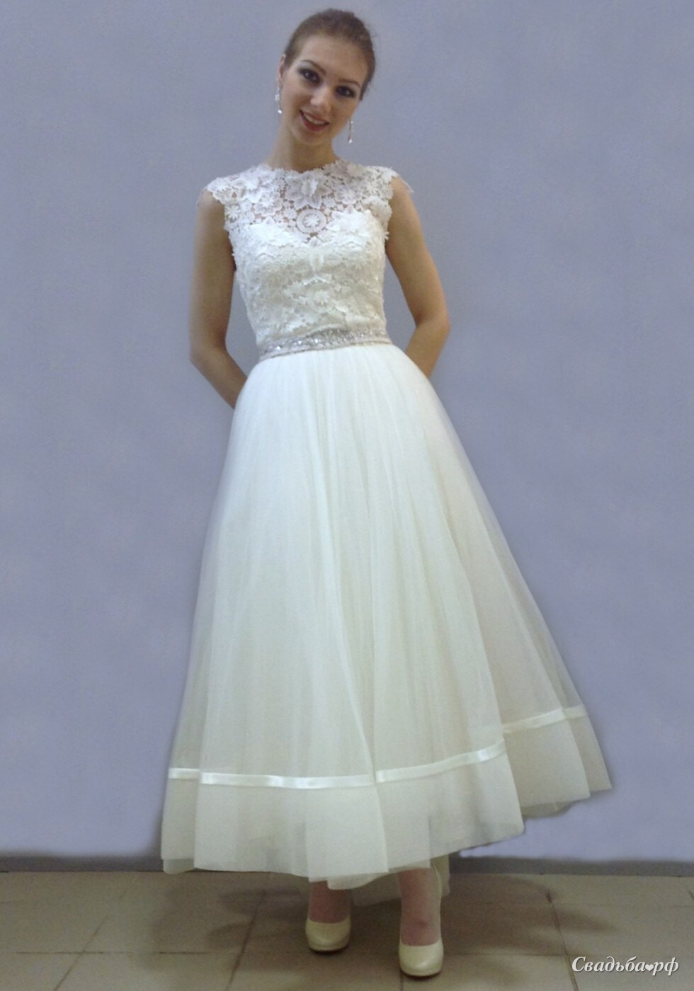 Кокетливое свадебное платье с кружевным верхом придётся по вкусу всем девушкам, которые хотят сочетать красоту и комфорт. Длина платья - миди - это модно, красиво и удобно.