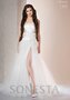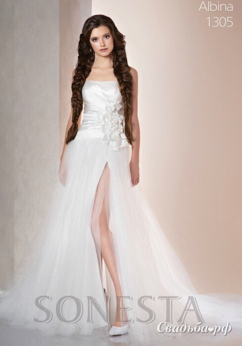 Роскошное свадебное платье придётся по душе самым игривым и стильным модницам. Атласный корсет с открытой зоной декольте декорирован сборками и объёмными цветами. Длинная юбка из воздушного фатина дополнена соблазнительным разрезом и кокетливым шлейфом.