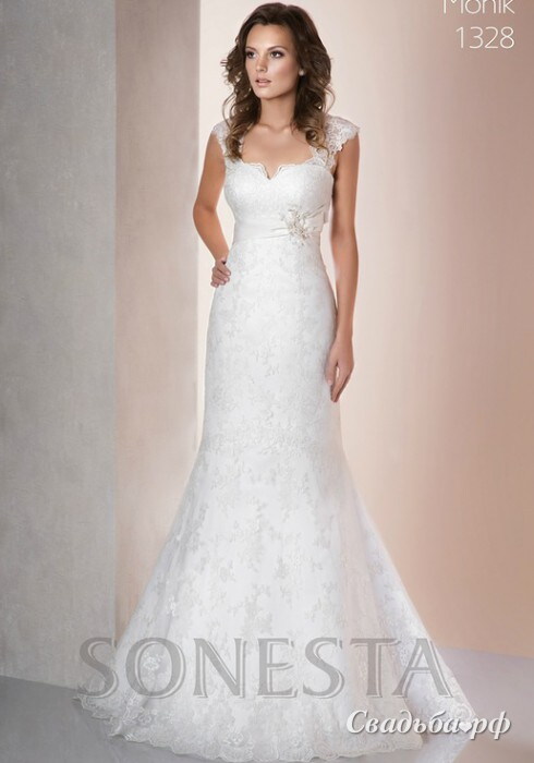 Элегантное свадебное платье со скромной зоной декольте, кружевными плечиками и пикантным вырезом на спине подчеркнёт ваш женственный образ. Изящный корсет декорирован лентой и миниатюрным бантом под грудью. От середины бедра облегающий наряд начинает расширяться и постепенно переходит в шлейф.