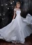 Романтическое свадебное платье понравится весьма скромным особам, зона декольте в нем прикрыта тонкой, почти прозрачной сеточкой, а плечи и лопатки – кружевом. Оно сшито из тонкой ткани с прилегающим лифом, который виден из-под слоя объемного кружевного полотна с неровным краем, заканчивающимся чуть ниже линии талии. На спинке – длинная застежка из маленьких белых пуговичек на спинке выглядят элементом декора. Юбка свадебного платья расширяется от талии книзу, заканчивается шлейфом.