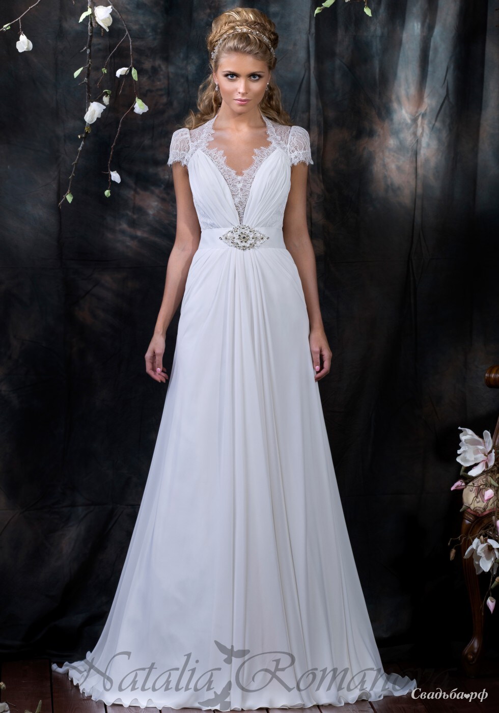 Верхняя часть спины прикрыта тонким кружевом, мелкие пуговички застежки выглядят декоративным элементом. Зона декольте с пятиугольным вырезом отделана широкой кружевной каймой. Небольшие рукавчики, необычные для свадебных платьев, выглядят здесь вполне уместно.