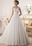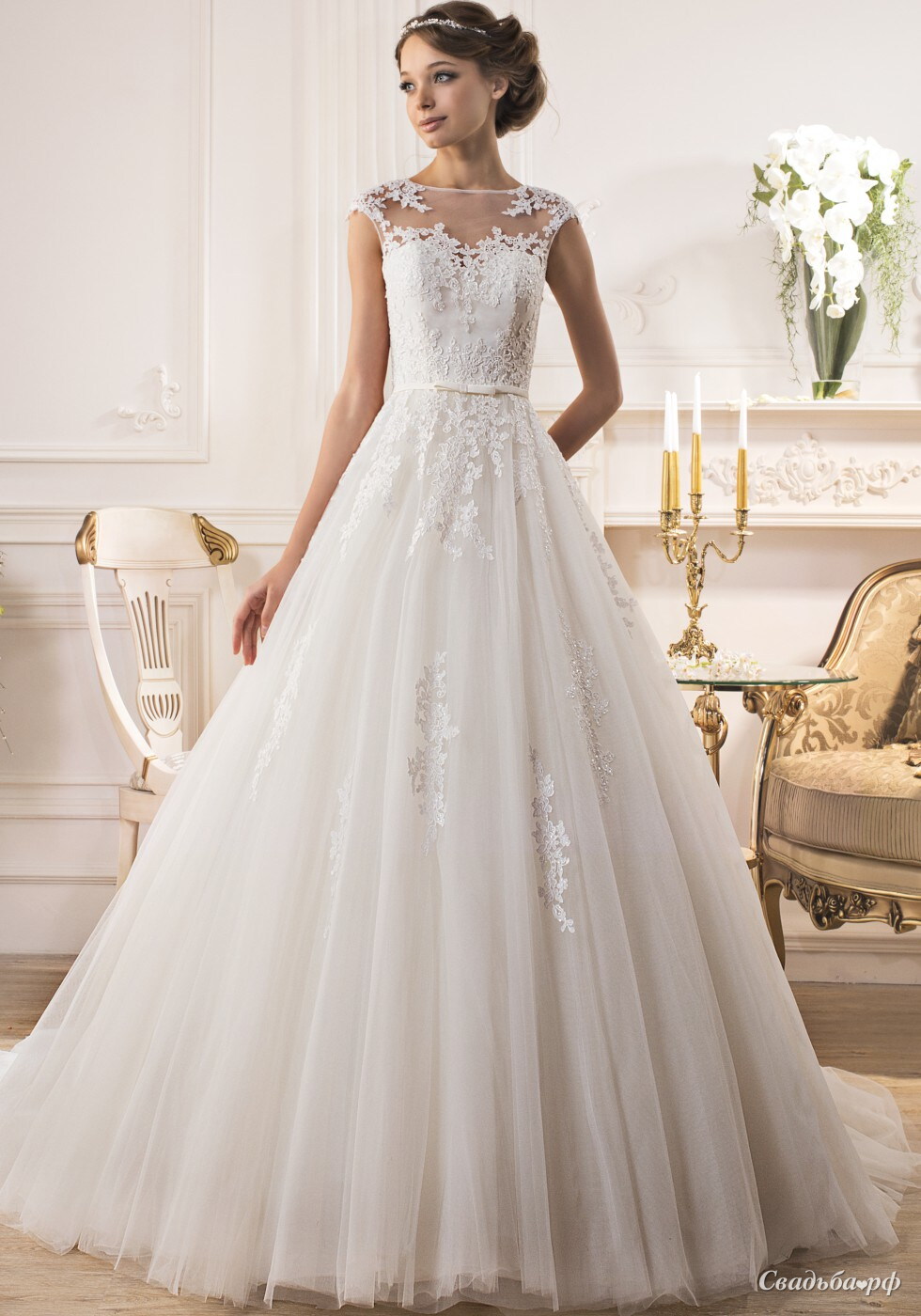 Классическое свадебное платье с полупрозрачной вставкой на груди и закрытыми плечиками идеально садится по фигуре. Наряд дополнен застёжкой с молнией и пуговицами на спинке. Кружевные цветы словно стекают с корсета на юбку. Талия украшена тонким поясом. Пышная юбка из невесомого фатина переходит в шлейф. Поистине царский образ.