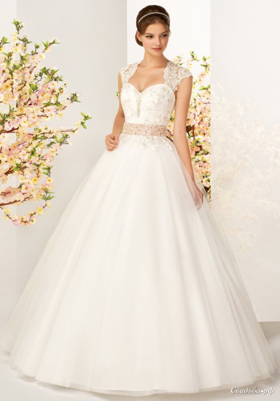 В этом свадебном платье очаровать любимого и околдовать гостей будет проще простого! Соблазнительная линия декольте с вырезом сердечко и кружевные бретели, закрывающие плечи, создают незабываемо волнующий и трогательный образ. Талия подчёркнута контрастным поясом с вышивкой. Пышная юбка поражает своими безупречными формами.
