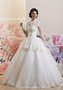 Романтические акценты этой модели: драпированный корсет, украшенный кружевом и съемное кружевное болеро. Традиционно пышная юбка делает платье еще прекраснее и привлекательнее для романтичной невесты.