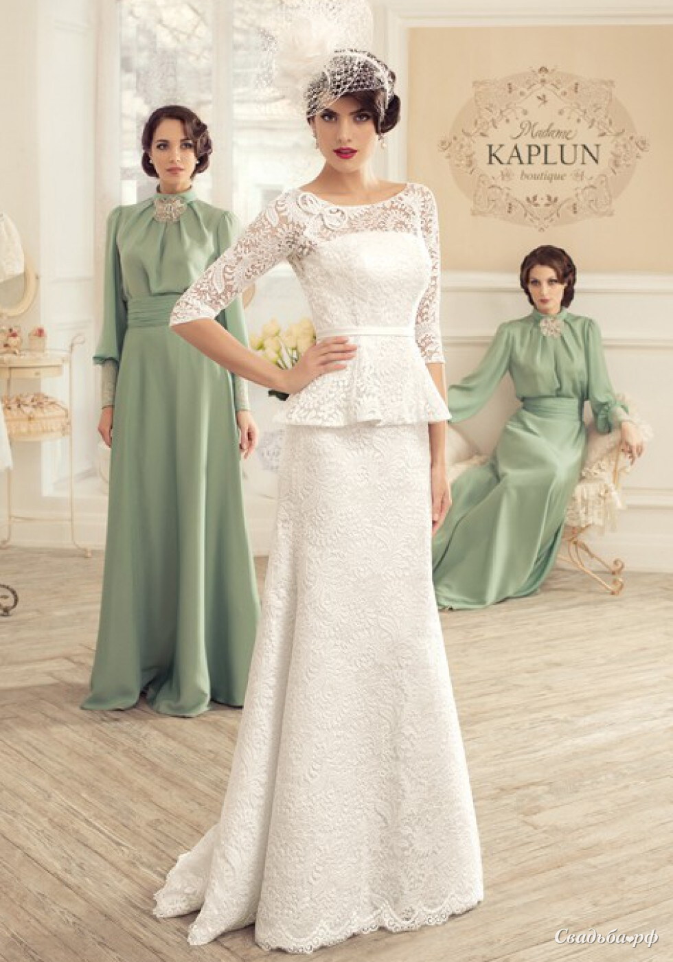 Стильное кружевное свадебное платье по силуэту с болеро и баской! Верх платья закрыт, спинка украшена пуговками из хрусталя. Нежный поясок подчеркивает талию. Платье подходит для венчания.