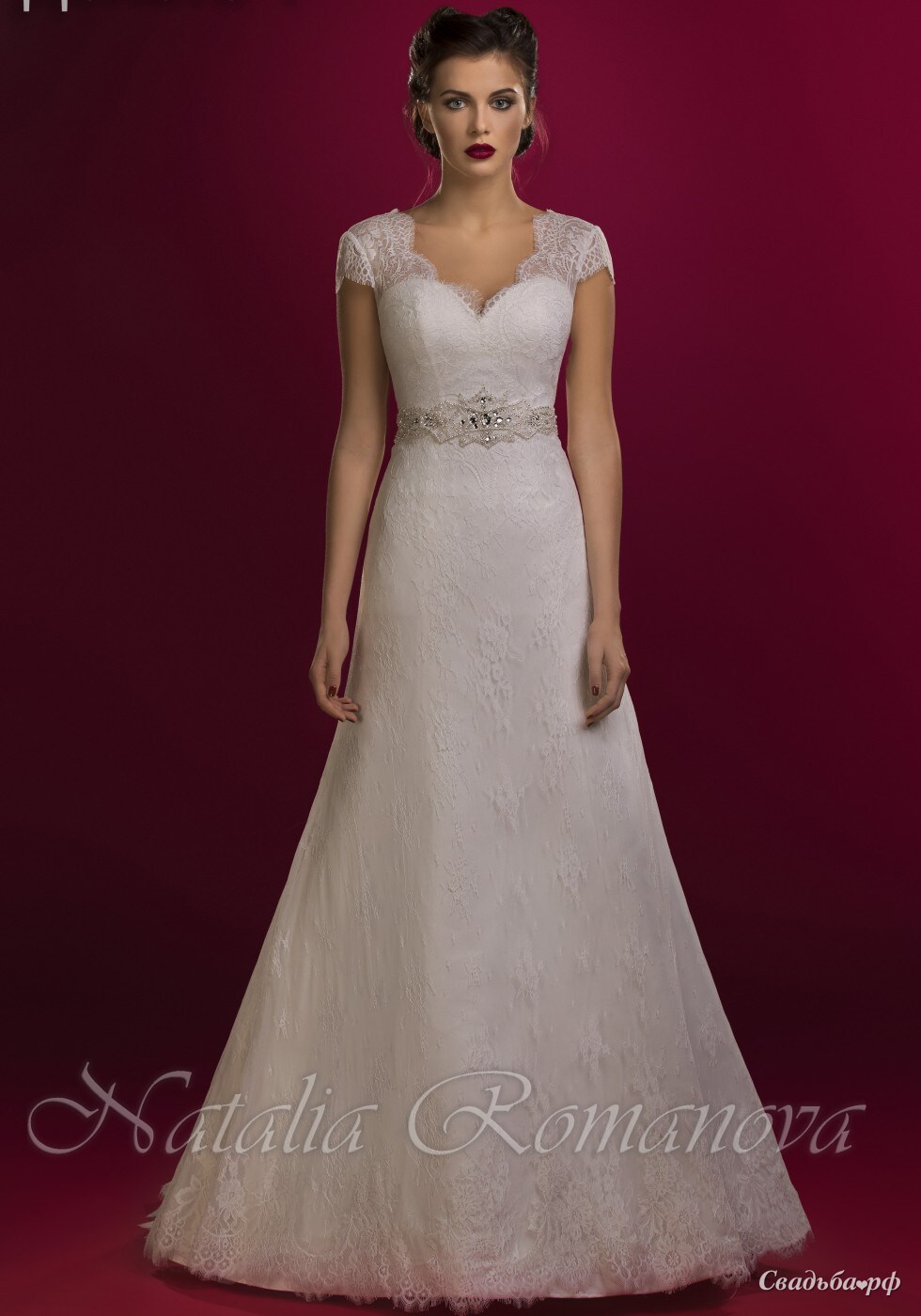 Элегантное кружевное платье прямого силуэта для молодой девушки. Платье с небольшим шлейфом и маленьким рукавчиком, создает образ сдержанный, но очень торжественный. Модель подходит для венчания.