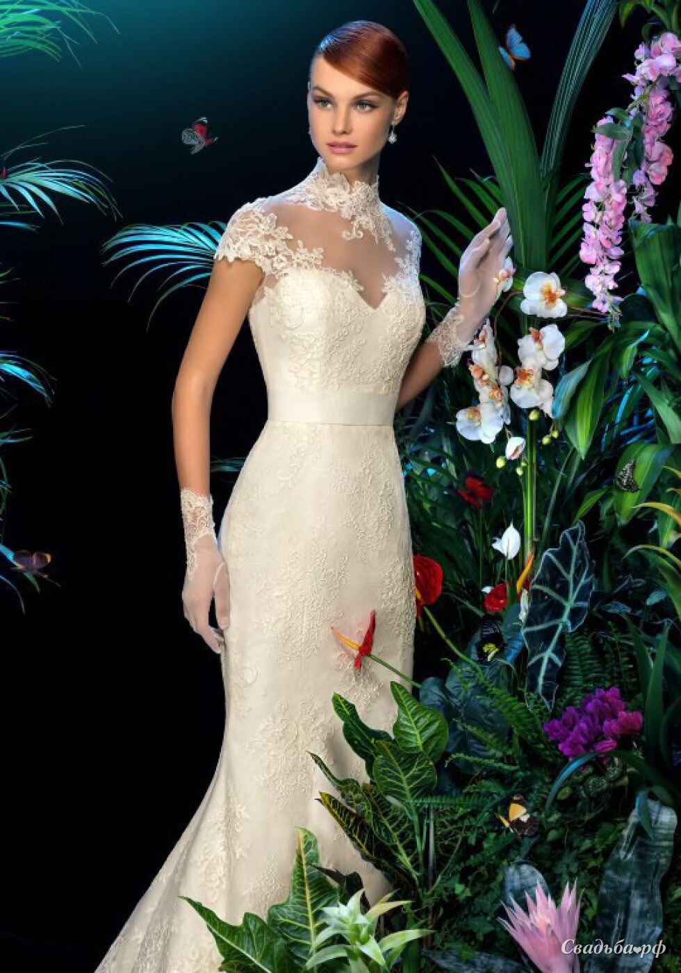 Прелестное кружевное платье для великолепного образа! Платье из тонкого атласа, покрытое кордовым кружевом. Силуэт платья очень мягкий, небольшой шлейф придает торжественность образу. Верх платья закрыт - небольшая стойка, украшенная кружевом, подчеркивает тонкую шею невесты. Образ романтичный и торжественный. Платье подходит для венчания.