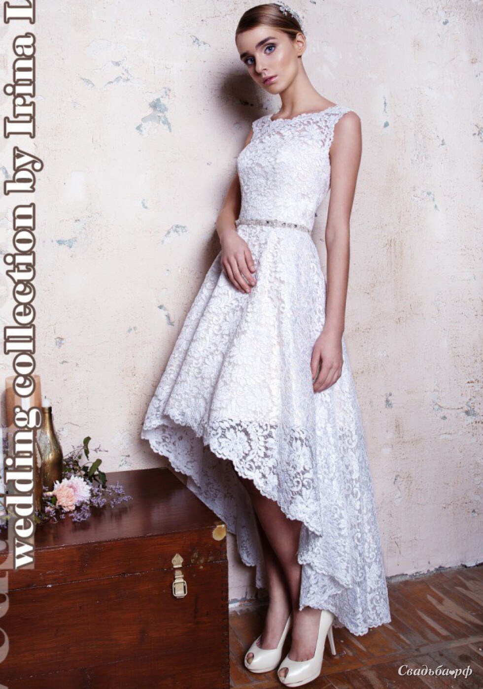 Милое кружевное платье разной длины. Модель изящная и романтичная, винтажное кружево делает это платье универсальным. Оно подходит как для свадебного торжества, так и для выпускного бала.