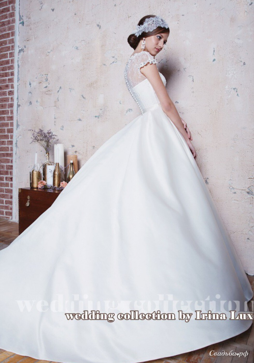 Полупрозрачный лиф "маечка" со спущенным рукавчиком из кружева с цветочным рисунком, застежка на атласные пуговки по всему силуэту платья и пышная юбка из атласа - волшебный образ для романтической невесты.