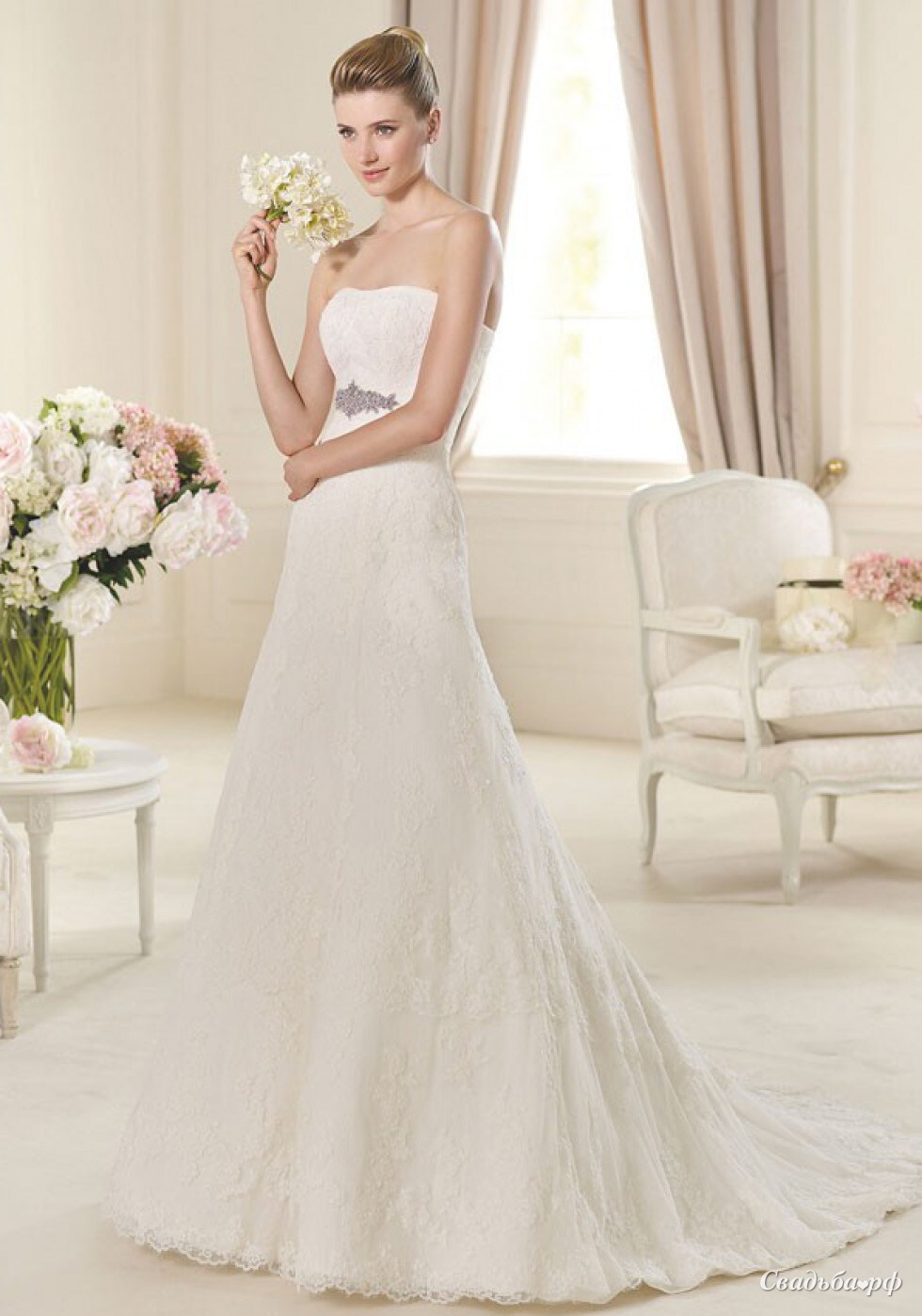 Великолепное платье для элегантного образа. Модель полностью кружевная с роскошным шлейфом и оригинальным украшением на корсете из камней сваровски.