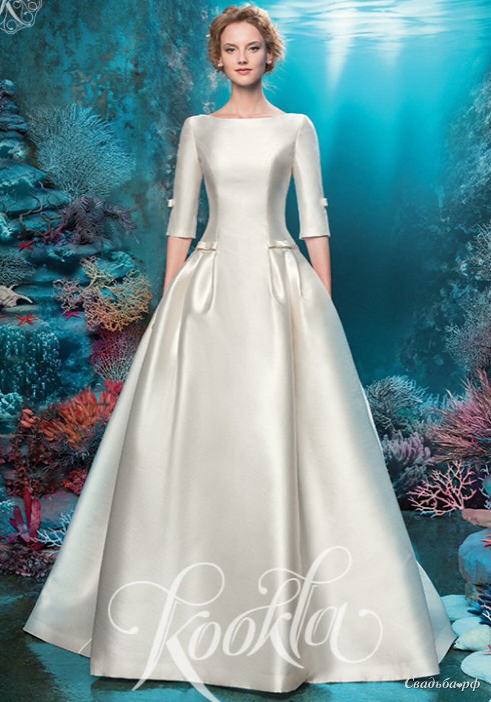 Великолепное платье из атласа микадо. Платье в классическом и модном стиле. Минимум украшений, главное - правильный крой. Рукав 3/4, спина открыта, юбка заложена мягкими складками. Модель украшена бантиками из атласа. Платье подходит для венчания.