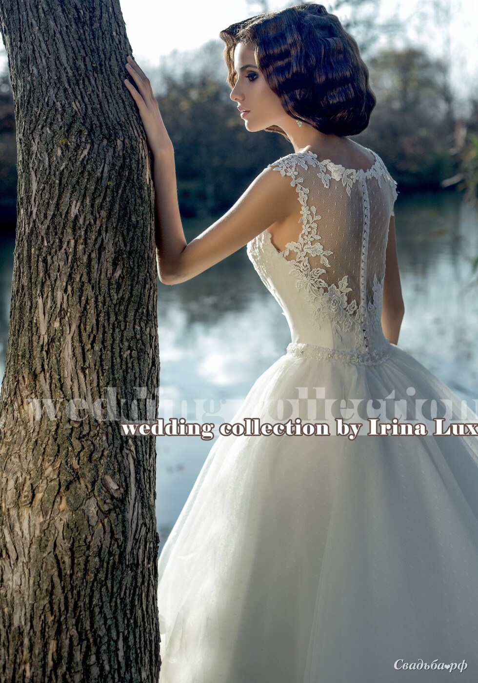 Пышное платье с кружевным корсетом без шлейфа. Спинка закрыта, изящные пуговички подчеркивают красоту спины, пояс украшен вышивкой из бисера в тон платья. Модель платья подходит для любой церемонии.