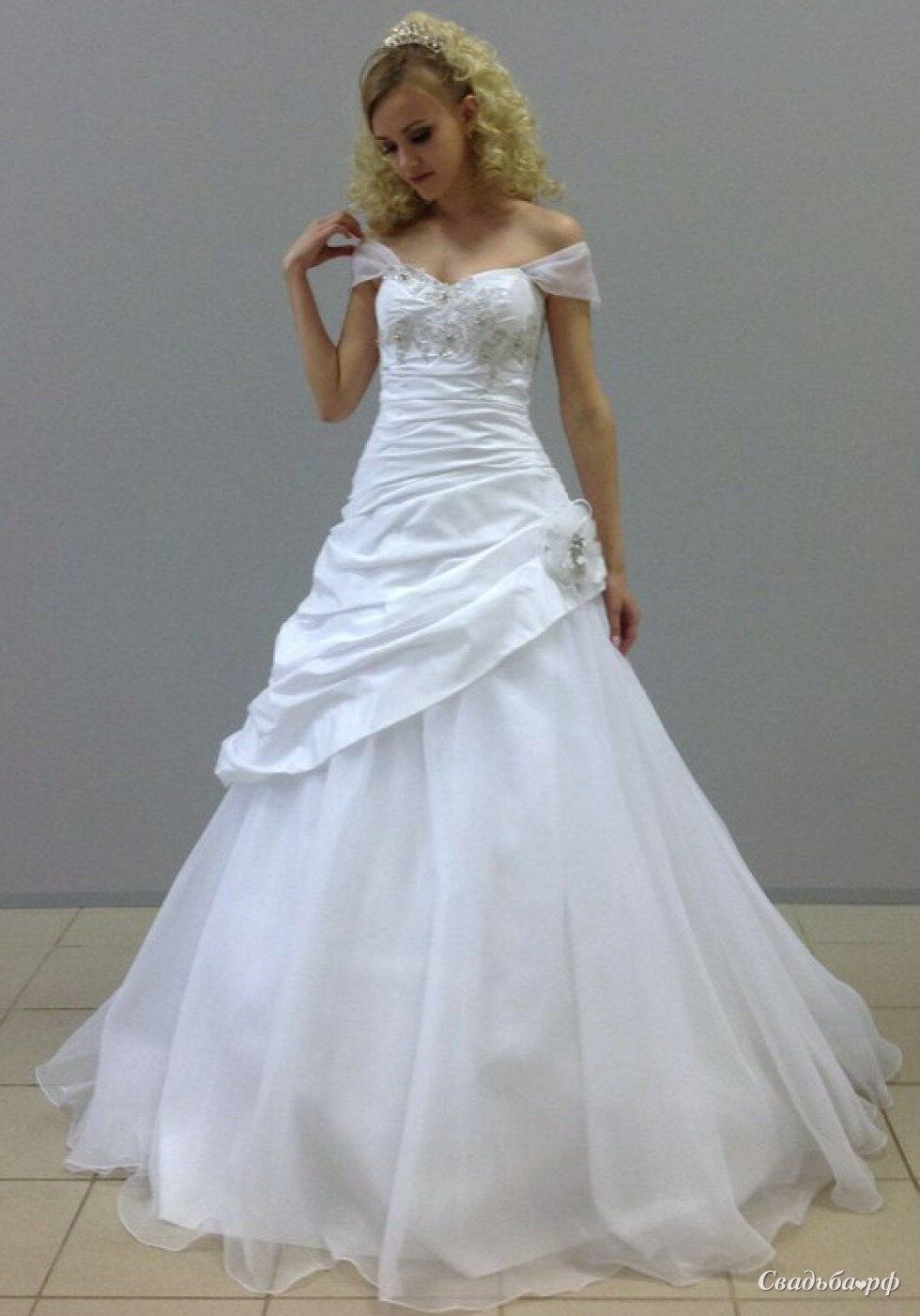 Романтичное свадебное платье А-силуэта для создания безупречного образа. Изюминкой этой модели являются асимметричные складки, которые подчеркивают тонкую талию невесты. Легкая ткань смотрится воздушно, нежные бретели — очень трогательно. Кружевные аппликации очень украшают платье, легкая вышивка в серебре создает объём на кружевных цветах. Модель для юной принцессы.