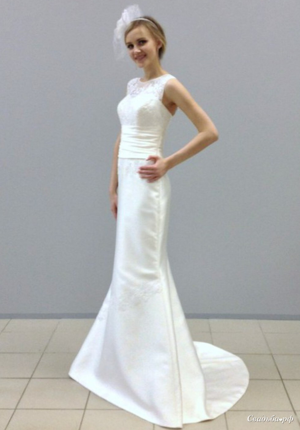 Стильное свадебное платье в стиле Русалочка с кружевным верхом и атласной юбкой. Нежное кружево на кокетке и корсете придает образу романтичность. Атласная юбка по силуэту подчеркивает фигуру. Платье подходит для венчания.