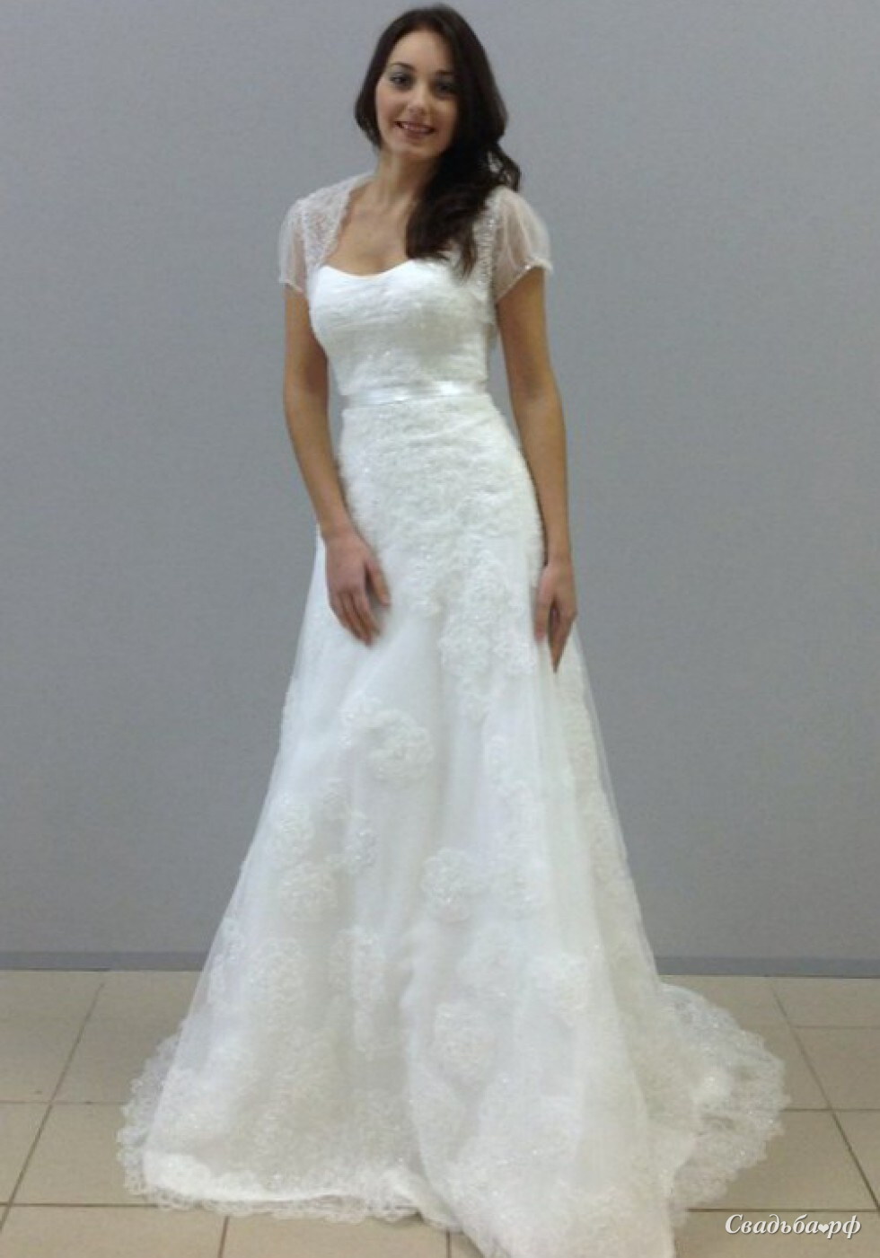 Кружевное платье классического А-силуэта с болеро для нежной невесты.