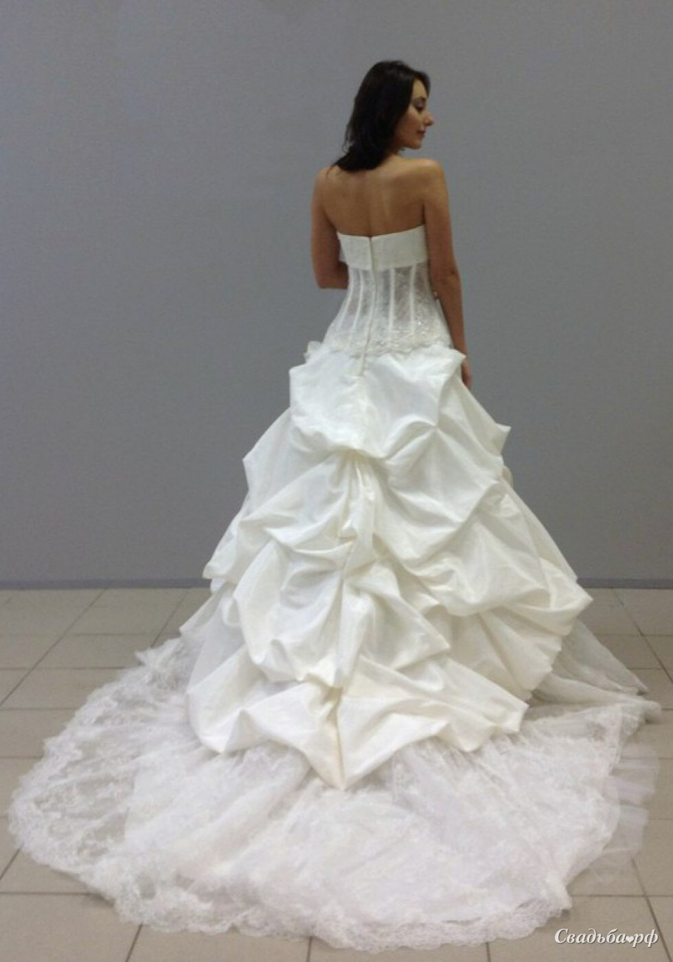 Великолепное свадебное платье со шлейфом и пышной юбкой. Корсет полупрозрачный с заниженной талией украшен кружевными аппликациями. Юбка из мягкой ткани заложена в объемные буфы. По низу юбка украшена широким кружевом.