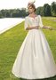 Великолепное платье с пышной юбкой из атласа. Рукав 3/4, корсет покрыт кружевом, юбка заложена в мягкие складки. На талии широкий пояс.