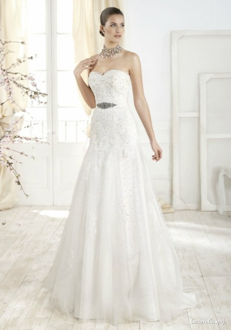 Классическое кружевное платье с заниженной талией. Декольте сердечком, очаровательная вышивка на кружеве, пояс с аппликацией из страз - все это создает очень торжественный образ невесты.