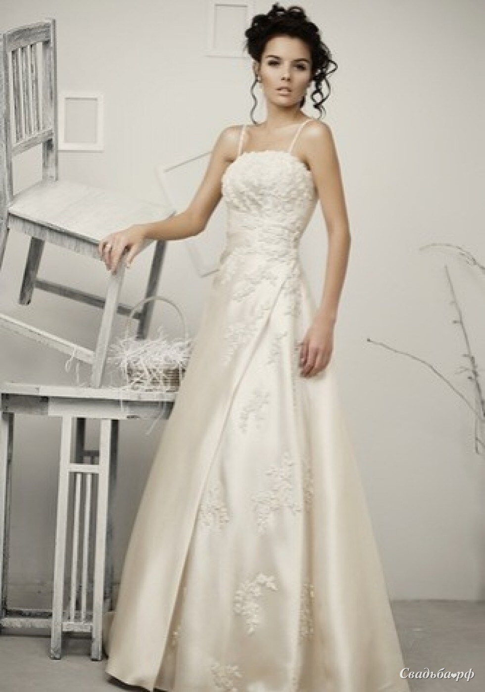 Классическое платье А-силуэта, расшитое бисером. Декольте ровное, корсет украшен аппликациями из кружевных цветов, которые плавно переходят на юбку. Запах на платье выгодно подчеркнет фигурку невесты. Платье подходит для беременных.