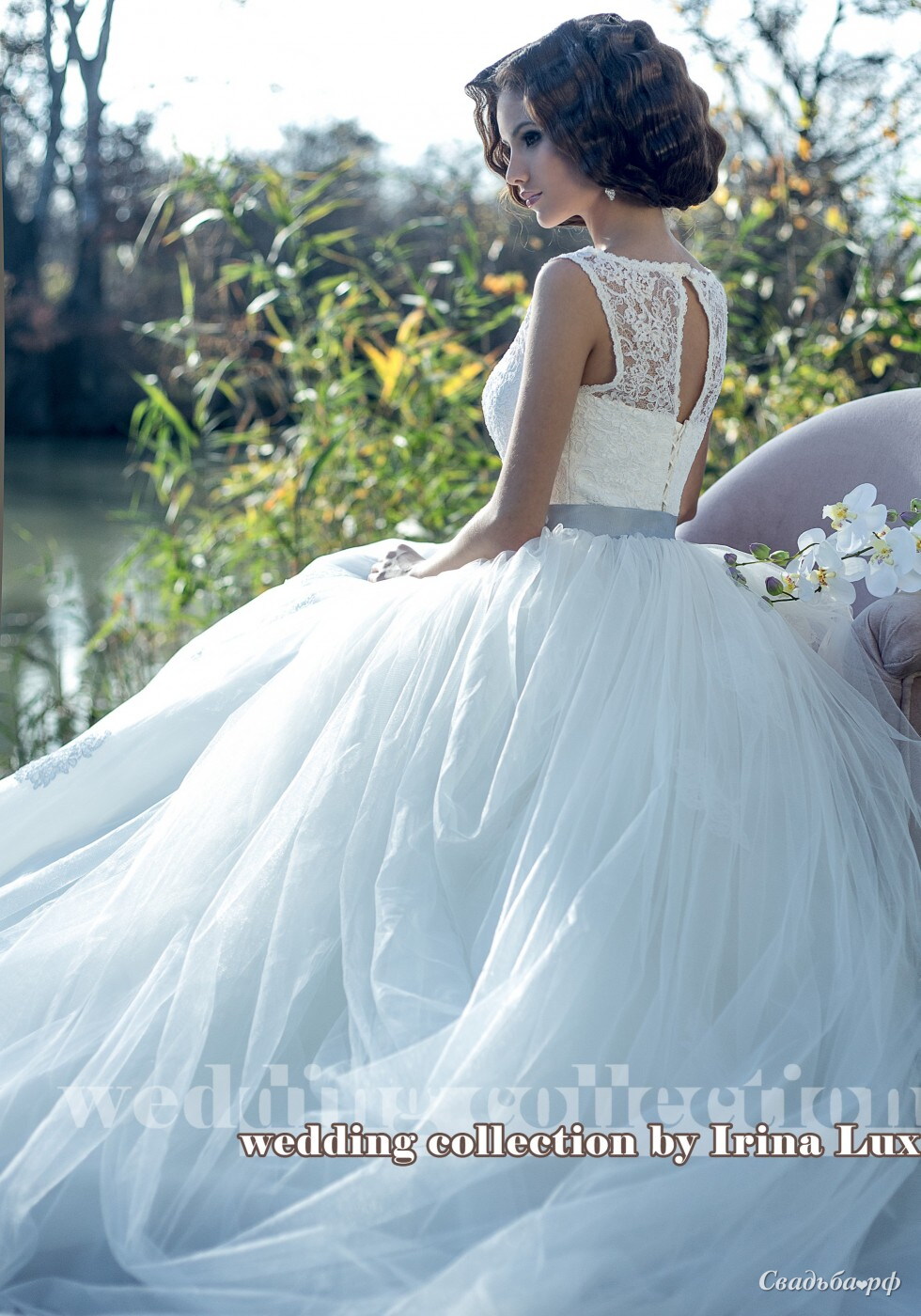 Классическое свадебное платье с кружевным верхом и пышной юбкой из легкого фатина, украшено аппликациями из кружева.