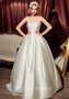 Пышное открытое платье из микадо. Юбка складками, корсет прямой, карманы, пояс и декольте расшиты жемчугом.