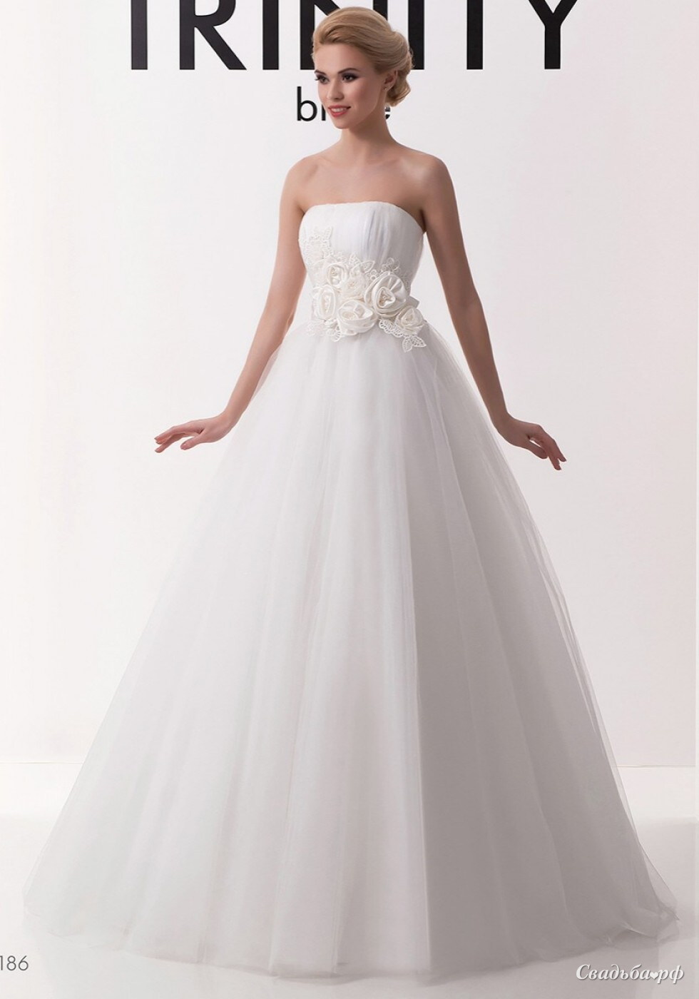 классическое платье с открытой зоной декольте и пышной юбкой. Корсет на шнуровке, драпировка на лифе очень выгодно подчеркивает грудь, композиция из цветов украшает весь образ. Талия слегка завышена, подойдет для беременной девушки.