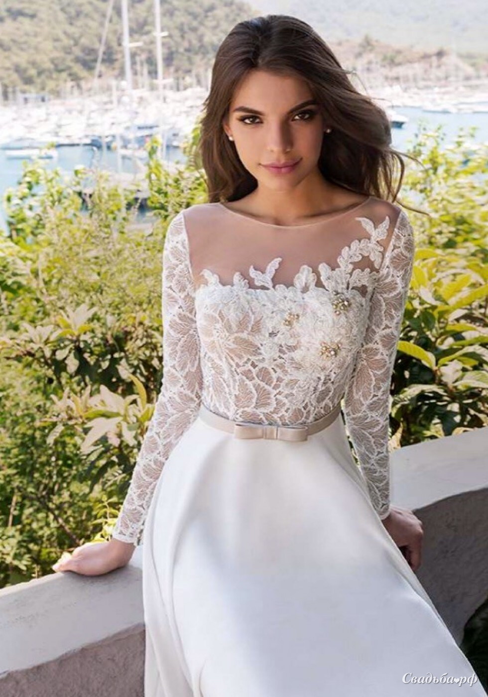 Очень нежное свадебное платье с рукавами. Юбка струится по силуэту, корсет кружевной с рукавами. Корсет украшен кружевными аппликациями, расшитыми бисером.