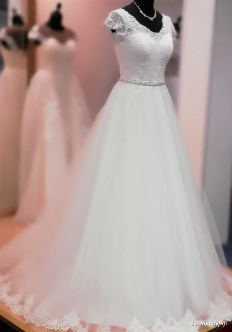 Классическое платье А-силуэта со шлейфом. Очень мягкое декольте открывает красивую шею невесты, маленький рукавчик прикрывает плечо, спинка на пуговичках. Талию подчеркивает поясок, расшитый стразами.