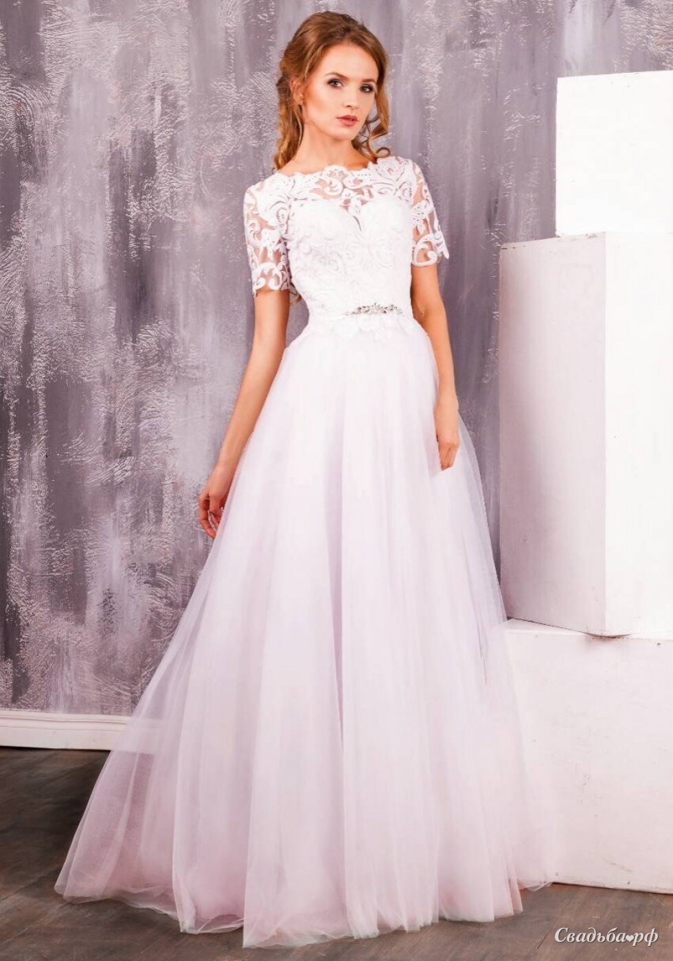 Очень нежное свадебное платье с кружевным корсетом, рукавчиком 3/4 и пышной юбкой из евротюля. Очень красивое. Можно заказывать с атласной юбкой.