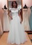 Классическое свадебное платье с закрытым верхом и легкой юбкой. Маленький рукавчик прикрывает плечико, поясок с бантиком подчеркивает талию.