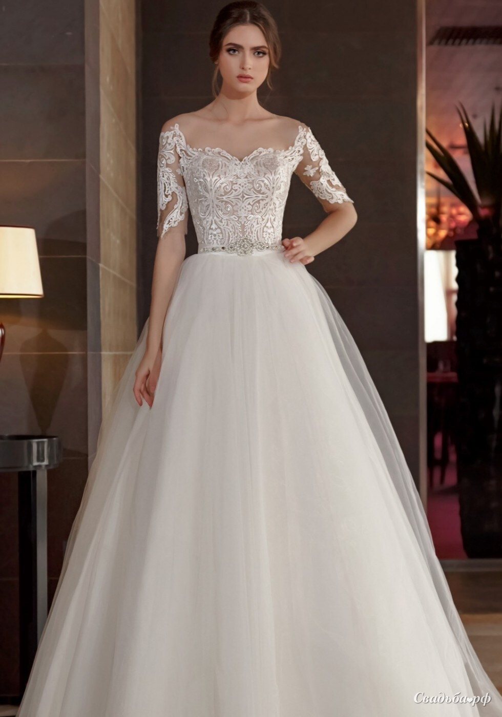 Роскошное платье с кружевным корсетом и пышной фатиновой юбкой со шлейфом.
