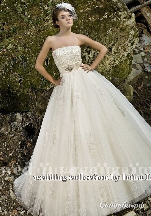 Роскошное платье с пышной юбкой. Корсет расшит хрусталем сваровски и стразами. На талии атласный пояс с аппликацией из кружева.