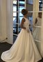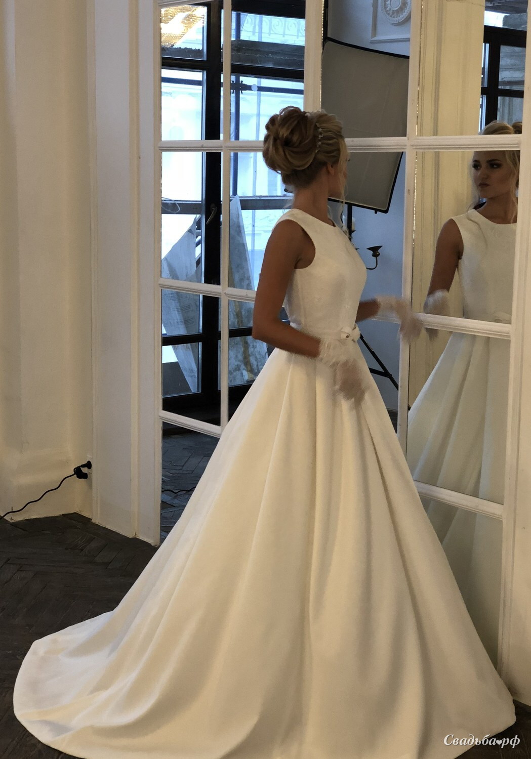 Очень нежное платье из лёгкого микадо. Верх закрыт, спинка деликатно открыта и украшена отложными лацканами. Юбка со шлейфом, уложена мягкими складками. Талия украшена оригинальным поясом с бантиком.