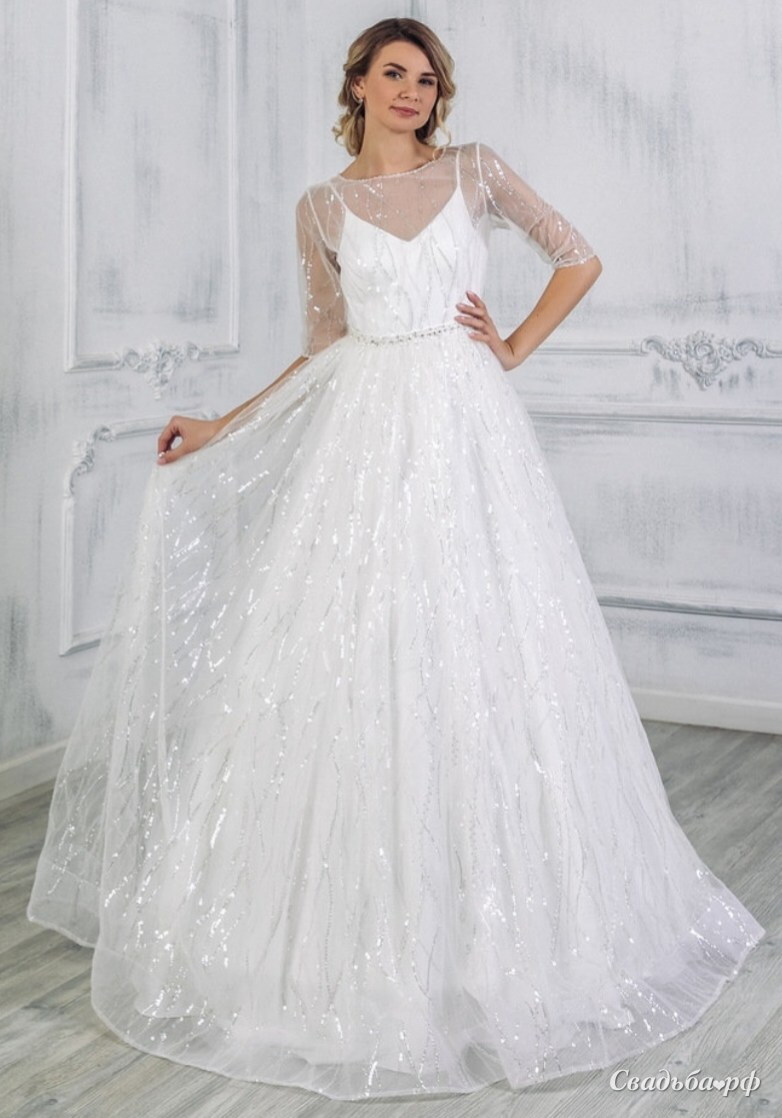 Платье для смелой невесты, которая хочет блистать! Оно сочетает в себе внутреннее платье из нежного гладкого щелка и верхней накидки с рукавами. Верхняя часть платья играет переливом вышивки, словно нити волшебного дождя.