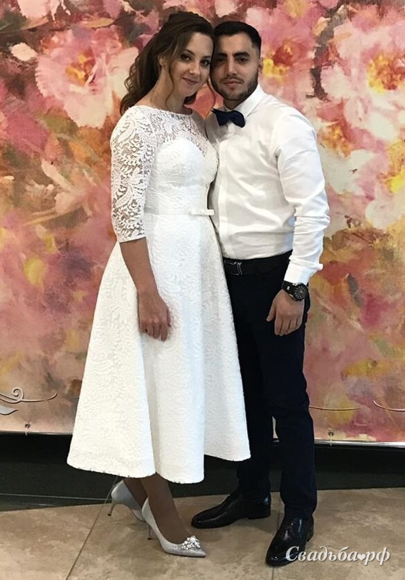 Лаконичное короткое кружевное платье. Модель есть в двух вариантах: с рукавом и майка. Платье очень милое и удобное, красивая длина миди, на талии поясок, спинка на пуговичках и, конечно, красивое кружево, — все это создает утонченный и современный образ невесты. Платье подходит как второе, как платье для загса, для венчания, для камерной свадьбы.