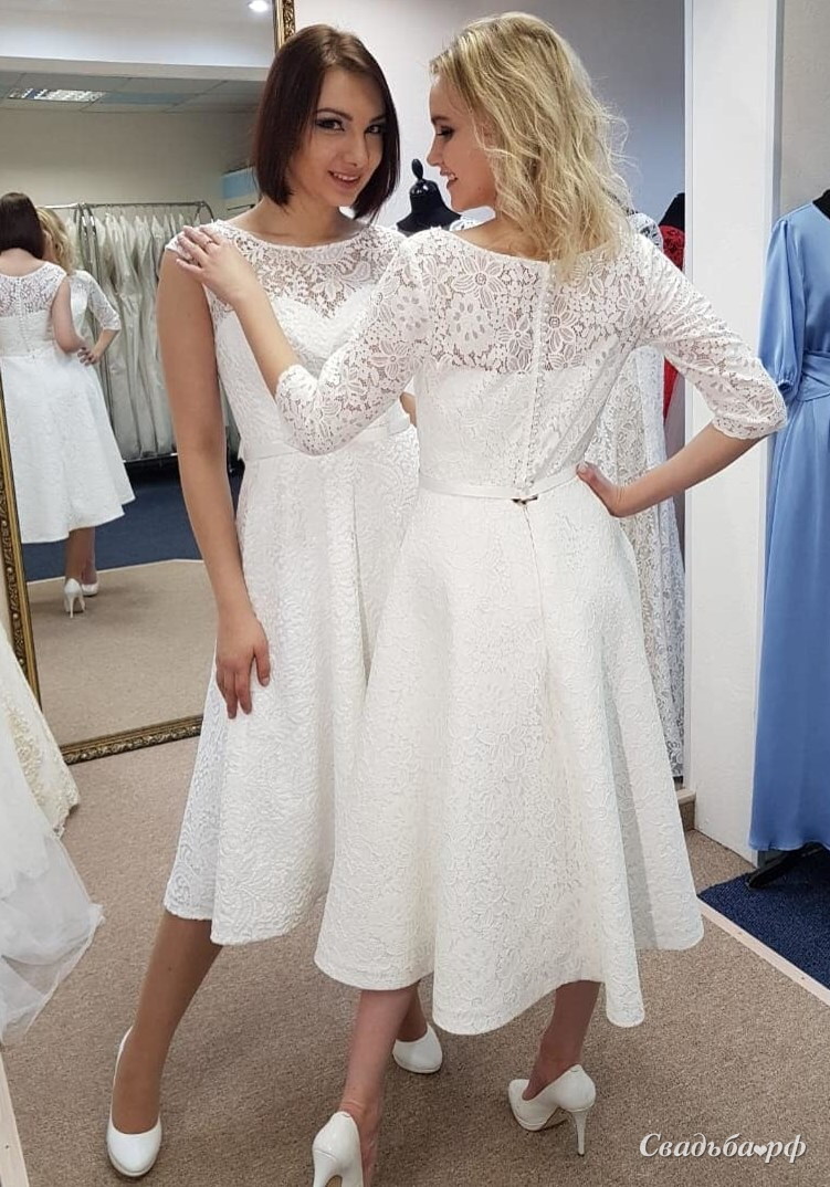 Кружевное свадебное платье длины миди. Модель исполнена в двух вариантах: с рукавами и без. Модель очень хороша для камерной свадьбы, регистрации свадьбы, венчания и как второе платье невесты!