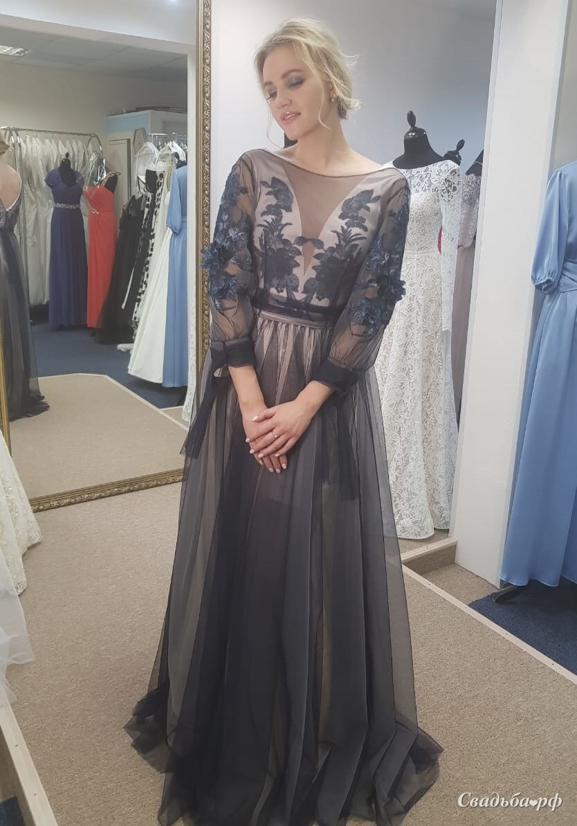 Платье-трансформер ! Очень эффектное сочетание цветов. Нежно-розовое платье-футляр с открытой спиной, украшеное аппликациями из кружевных цветов синего цвета с голубыми нитями. Накидка из нежного фатина с пышным рукавом фонарик, также украшенным кружевными цветами.